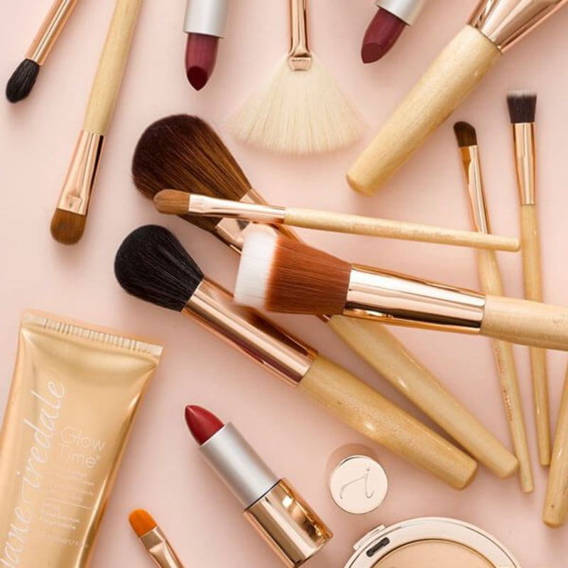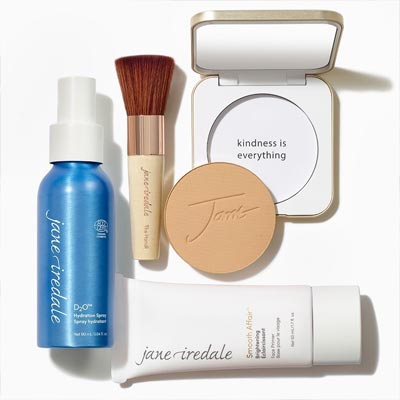 Jane Iredale skincare makeup products arranged with brushes and powders