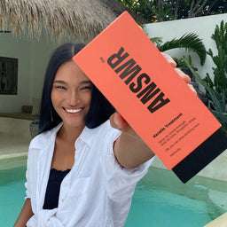 Woman holding a bottle of 'ANSWER' product with a white background