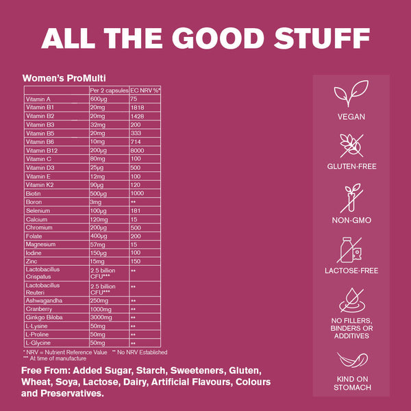 Calcium (Tri-Calcium Citrate), Magnesium Bisglycinate, Vitamin C (Calcium L-ascorbate), Zinc Bisglycinate, L-Lysine Hydrochloride, Ginkgo Biloba Extract, L-Glycine, L-Proline, Vitamin B3 (Nicotinamide), Cranberry Extract (Vaccinium macrocarpon), Vitamin B2 (Riboflavin 5prime;-phosphate, sodium), Vitamin B1 (Thiamin Mononitrate), Vitamin B5 (Pantothenic Acid, Calcium salt), Lactobacillus Crispatus, Lactobacillus Reuteri, Ashwagandha Extract (Withania somnifera), Vitamin E (D-Alpha Tocopherol Acid Succinate), Vitamin D3 (Cholecalciferol), Vitamin B6 (Pyridoxal-5;-Phosphate), Vitamin B12 (Methylcobalamin), Vitamin K2 (Menaquinone-7), Vitamin A (Retinyl palmitate), Boron (Boric Acid), Chromium Picolinate, Folate (Calcium-L-Methylfolate), D-Biotin, Selenium (L-Selenomethionine), Potassium Iodide, Capsule Shell (HydroxypropylMethylcellulose)