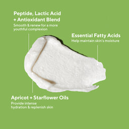 This formula has been enriched with a blend of lactic acid, rejuvenating peptide and antioxidant Vitamin E to smooth and renew skin. Apricot and starflower oils provide intense hydration and replenish for more nourished skin. Jojoba seed oil helps balance and improve skin radiance.