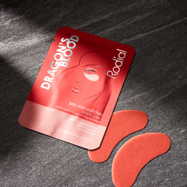 Remove the Dragon’s Blood Jelly Eye Patches from the tray and protective sheets. Apply under the eyes on clean skin and leave for 20-30 minutes, massaging excess product into your skin. Discard after use and then apply the Dragon’s Blood Eye Gel. Apply around your eye area and under the brow bone. Layer on the Dragon’s Blood Water Serum, massaging into your face and neck. Follow with your favourite Rodial moisturiser.