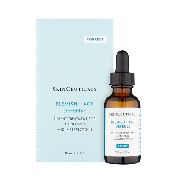 âSkinCeuticals Blemish + AGE Defense Serum contains a powerful blend of Glycolic and Salicylic Acid helping to reduce congestion and combat the ageing process.